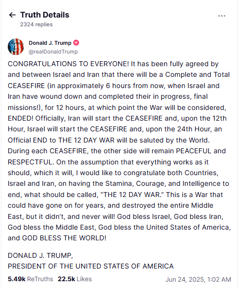 Khoảng 23h (giờ Mỹ), Tổng thống Mỹ Donald Trump bất ngờ tuyên bố về một mốc thời gian ngừng bắn giữa Israel và Iran – động thái mà ông tin rằng sẽ chấm dứt cuộc xung đột giữa hai quốc gia Trung Đông này.