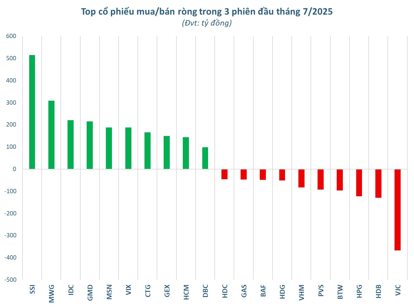 Chỉ tính riêng trong 3 phiên đầu tháng 7 vừa qua, dòng tiền ngoại đã giải ngân mua ròng mạnh. Cổ phiếu chứng khoán SSI dẫn đầu với giá trị hơn 515 tỷ đồng. Bên cạnh đó, VIX, HCM cũng là những đại diện nhóm chứng khoán được gom mạnh trong bối cảnh kỳ vọng TTCK vào chu kỳ tăng trưởng mới.