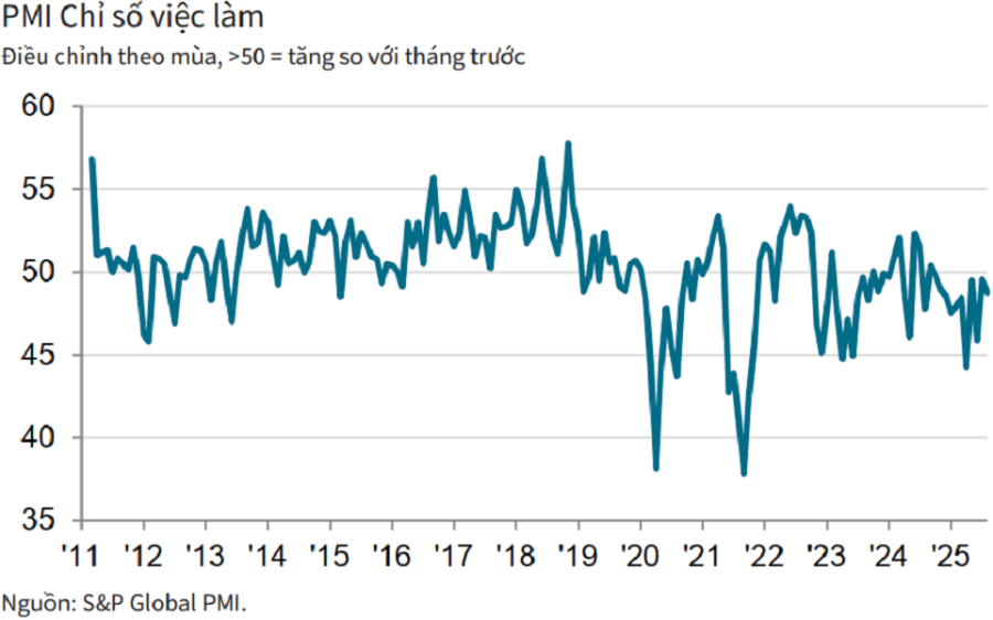Báo cáo của S&P Global cho biết với số lượng đơn đặt hàng mới giảm, các công ty tiếp tục phải giảm số lượng lao động vào cuối quý 3 của năm. Việc làm đã giảm tháng thứ 11 liên tiếp, và mức giảm là nhẹ. Tuy nhiên, số lượng đơn đặt hàng mới giảm mạnh khiến năng lực sản xuất trong ngành chưa được sử dụng hết. Lượng công việc tồn đọng giảm đáng kể, và mức độ giảm là lớn nhất kể từ tháng 4.