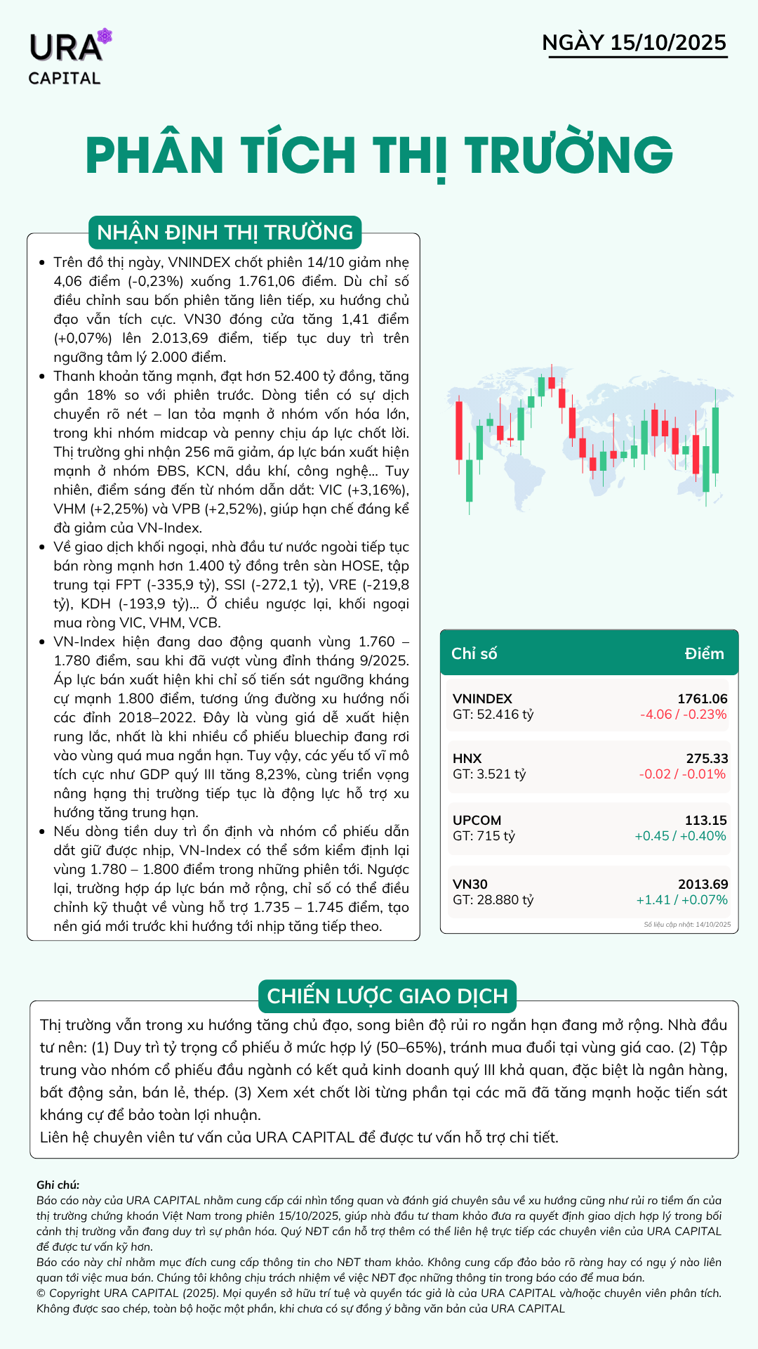 Phân tích thị trường 15/10/2025 Thứ Tư, 15/10/2025 uracapital Chia sẻ bài viết: Menu Trang chủ Tin tức Báo cáo & Phân tích Báo cáo Phân tích Dịch vụ Tư vấn đầu tư Đào tạo kiến thức đầu tư Quản lý danh mục đầu tư Tư vấn kế hoạch tài chính Kiến thức đầu tư Kiến thức cơ bản Kiến thức nâng cao Phân tích kỹ thuật Phân tích kỹ thuật Phân tích cơ bản Hỗ trợ Hướng dẫn giao dịch Liên hệ Về Ura Capital Tin tức nổi bật