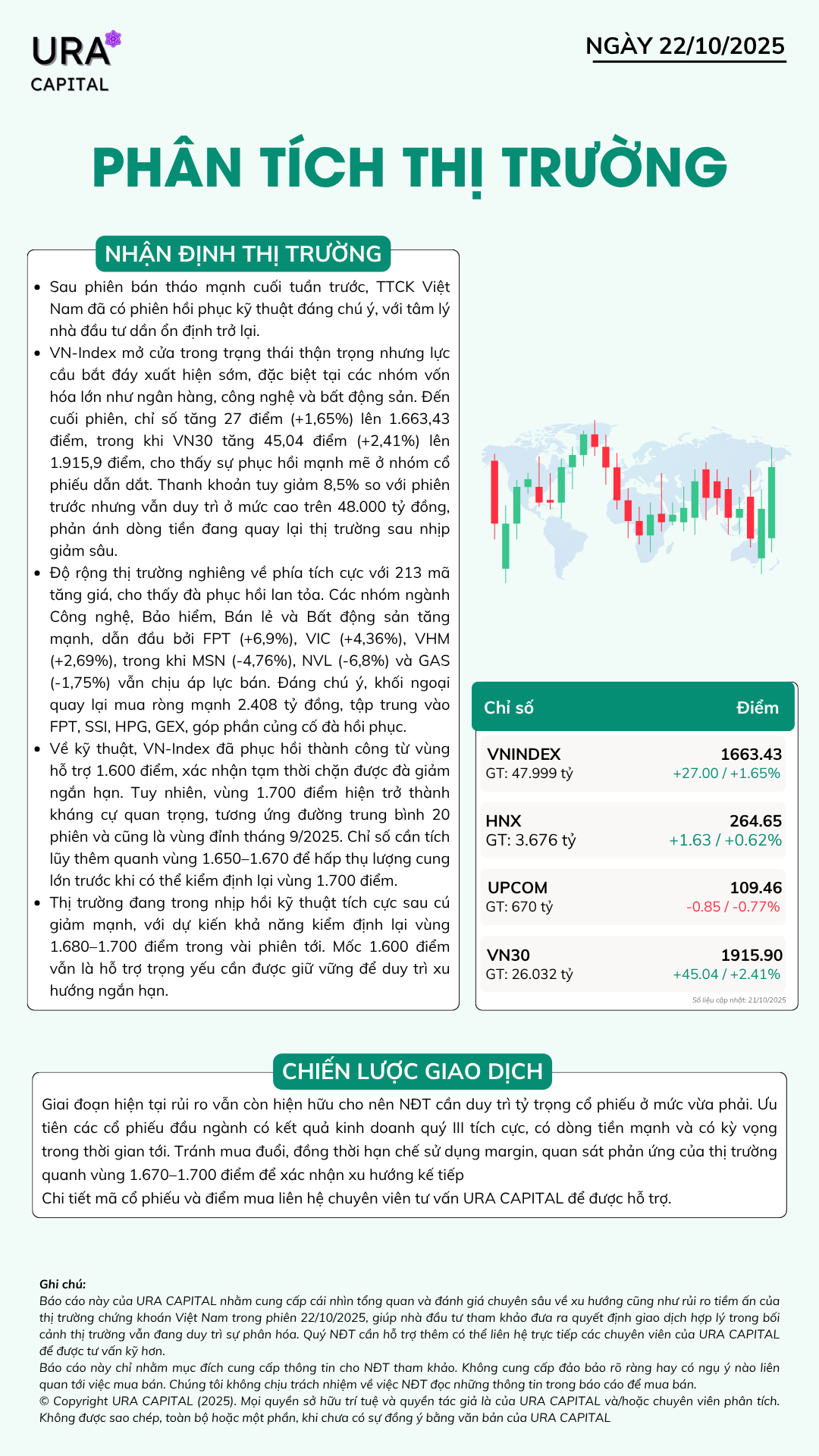Phân tích thị trường 22/10/2025 Thứ Tư, 22/10/2025 uracapital Chia sẻ bài viết: Menu Trang chủ Tin tức Báo cáo & Phân tích Báo cáo Phân tích Dịch vụ Tư vấn đầu tư Đào tạo kiến thức đầu tư Quản lý danh mục đầu tư Tư vấn kế hoạch tài chính Kiến thức đầu tư Kiến thức cơ bản Kiến thức nâng cao Phân tích kỹ thuật Phân tích kỹ thuật Phân tích cơ bản Hỗ trợ Hướng dẫn giao dịch Liên hệ Về Ura Capital Tin tức nổi bật