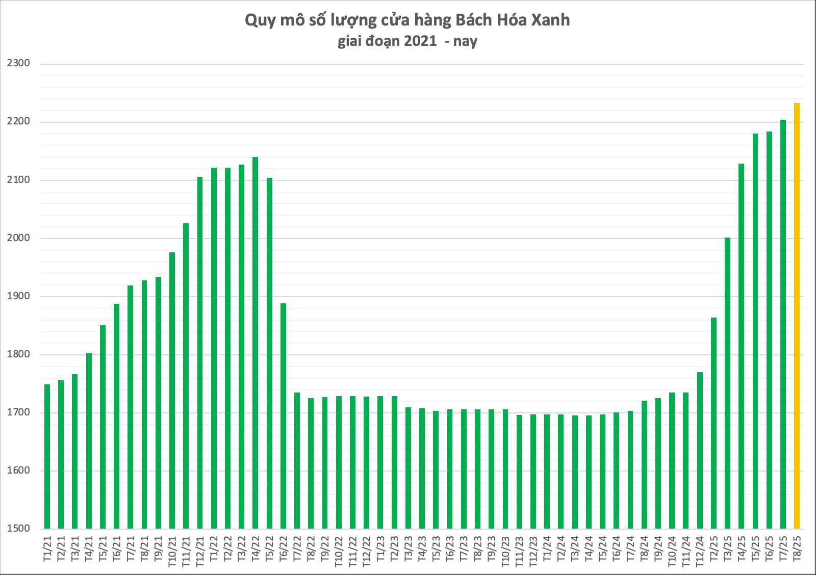 Hiện MWG có tổng cộng 2.233 cửa hàng BHX, tiếp tục đưa quy mô chuỗi siêu thị này lên con số kỷ lục mới. Sau khi có lãi, BHX rục rịch mở mới các cửa hàng từ quý 3 năm ngoái trước khi mở rộng hệ thống ồ ạt từ đầu năm nay.