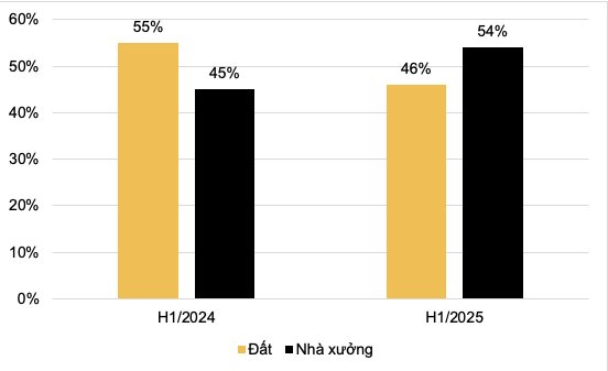 Khác với cùng kỳ 2024, giao dịch nhà xưởng vượt giao dịch đất về số lượng dự án. Trong 759 dự án FDI sản xuất mới, 410 dự án (54%) chọn thuê nhà xưởng thay vì đất. Điều này phản ánh xu hướng thị trường ưu tiên tốc độ, tính linh hoạt và khả năng mở rộng, đồng thời cho thấy sự gia tăng nhu cầu với nhà xưởng xây sẵn - đặc biệt trong các ngành điện tử, lắp ráp và bao bì, nơi doanh nghiệp ưu tiên vào thị trường nhanh và giảm chi phí đầu tư ban đầu.
