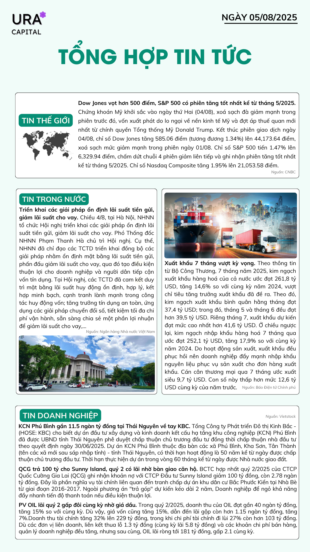 Tổng hợp tin tức 05/08/2025 Thứ Ba, 05/08/2025 uracapital Chia sẻ bài viết: Menu Trang chủ Tin tức Báo cáo & Phân tích Báo cáo Phân tích Dịch vụ Tư vấn đầu tư Đào tạo kiến thức đầu tư Quản lý danh mục đầu tư Tư vấn kế hoạch tài chính Kiến thức đầu tư Kiến thức cơ bản Kiến thức nâng cao Phân tích kỹ thuật Phân tích kỹ thuật Phân tích cơ bản Hỗ trợ Hướng dẫn giao dịch Liên hệ Về Ura Capital Tin tức nổi bật