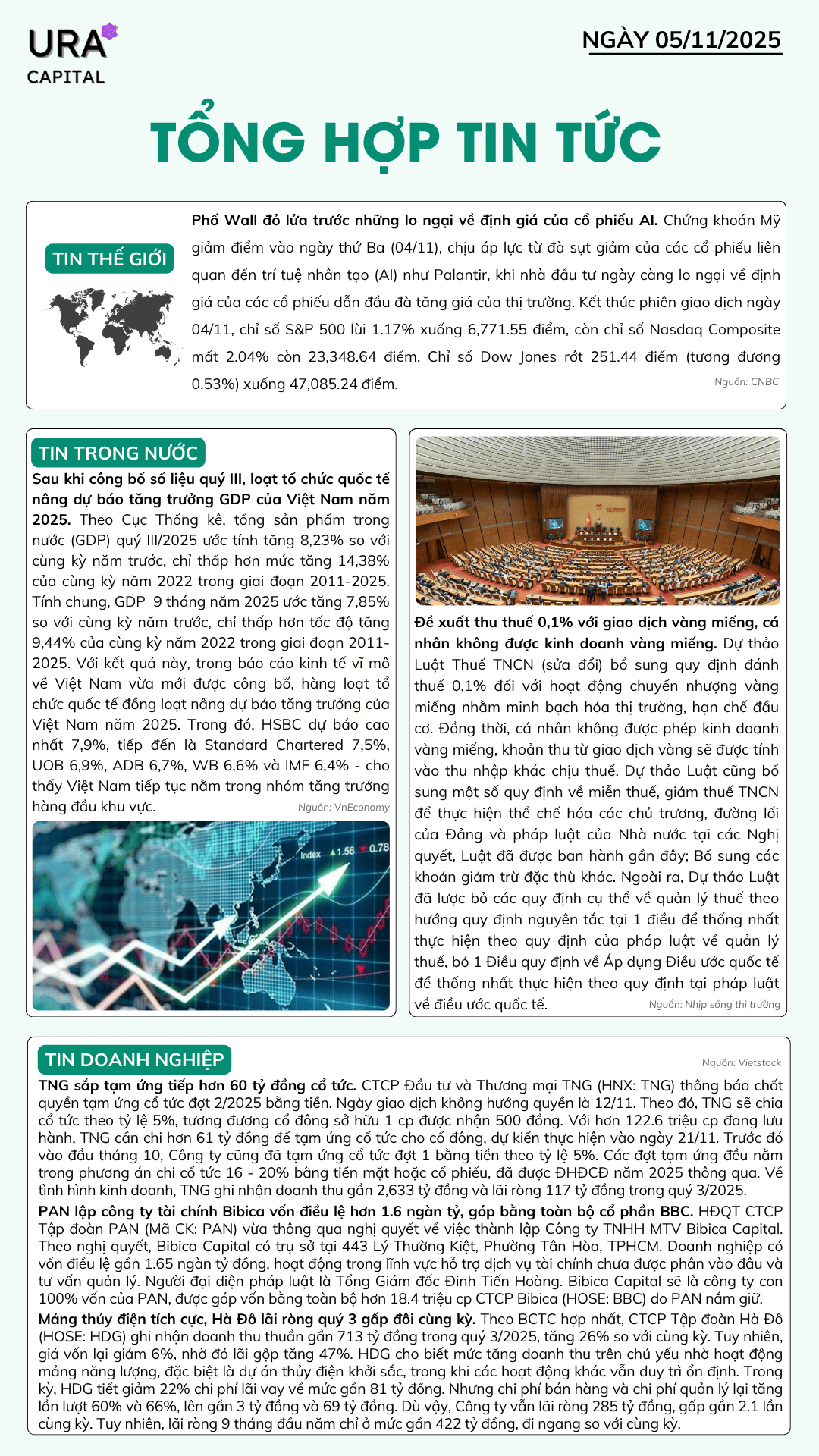 Tổng hợp tin tức 05/11/2025 Thứ Tư, 05/11/2025 uracapital Chia sẻ bài viết: Menu Trang chủ Tin tức Báo cáo & Phân tích Báo cáo Phân tích Dịch vụ Tư vấn đầu tư Đào tạo kiến thức đầu tư Quản lý danh mục đầu tư Tư vấn kế hoạch tài chính Kiến thức đầu tư Kiến thức cơ bản Kiến thức nâng cao Phân tích kỹ thuật Phân tích kỹ thuật Phân tích cơ bản Hỗ trợ Hướng dẫn giao dịch Liên hệ Về Ura Capital Tin tức nổi bật