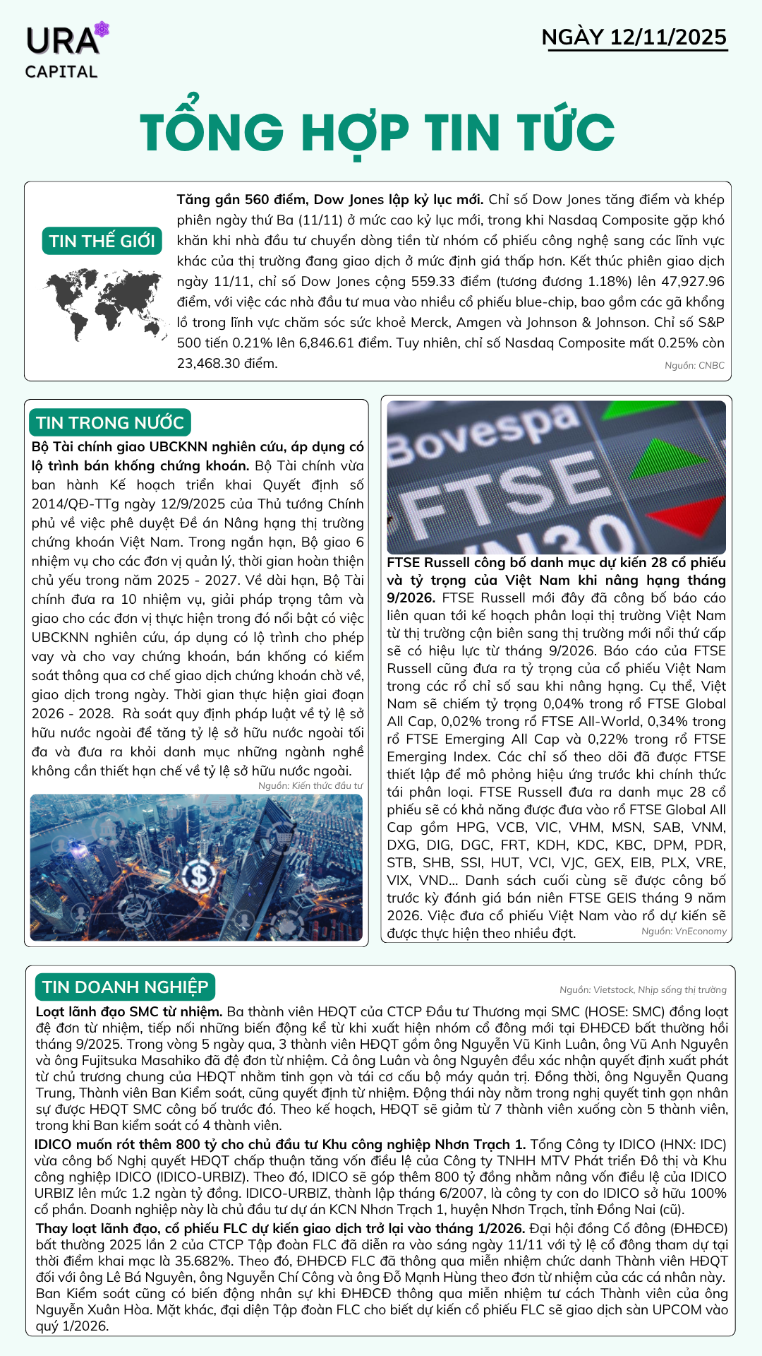 Tổng hợp tin tức 12/11/2025 Thứ Tư, 12/11/2025 uracapital Chia sẻ bài viết: Menu Trang chủ Tin tức Báo cáo & Phân tích Báo cáo Phân tích Dịch vụ Tư vấn đầu tư Đào tạo kiến thức đầu tư Quản lý danh mục đầu tư Tư vấn kế hoạch tài chính Kiến thức đầu tư Kiến thức cơ bản Kiến thức nâng cao Phân tích kỹ thuật Phân tích kỹ thuật Phân tích cơ bản Hỗ trợ Hướng dẫn giao dịch Liên hệ Về Ura Capital Tin tức nổi bật