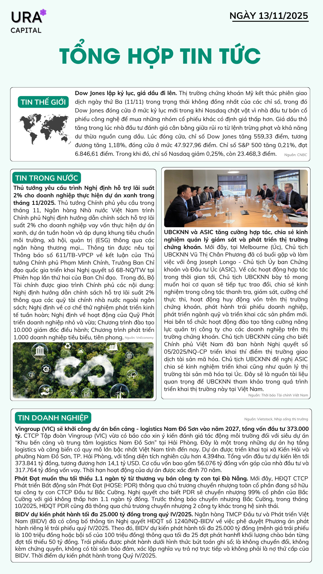 Tổng hợp tin tức 13/11/2025 Thứ Năm, 13/11/2025 uracapital Chia sẻ bài viết: Menu Trang chủ Tin tức Báo cáo & Phân tích Báo cáo Phân tích Dịch vụ Tư vấn đầu tư Đào tạo kiến thức đầu tư Quản lý danh mục đầu tư Tư vấn kế hoạch tài chính Kiến thức đầu tư Kiến thức cơ bản Kiến thức nâng cao Phân tích kỹ thuật Phân tích kỹ thuật Phân tích cơ bản Hỗ trợ Hướng dẫn giao dịch Liên hệ Về Ura Capital Tin tức nổi bật