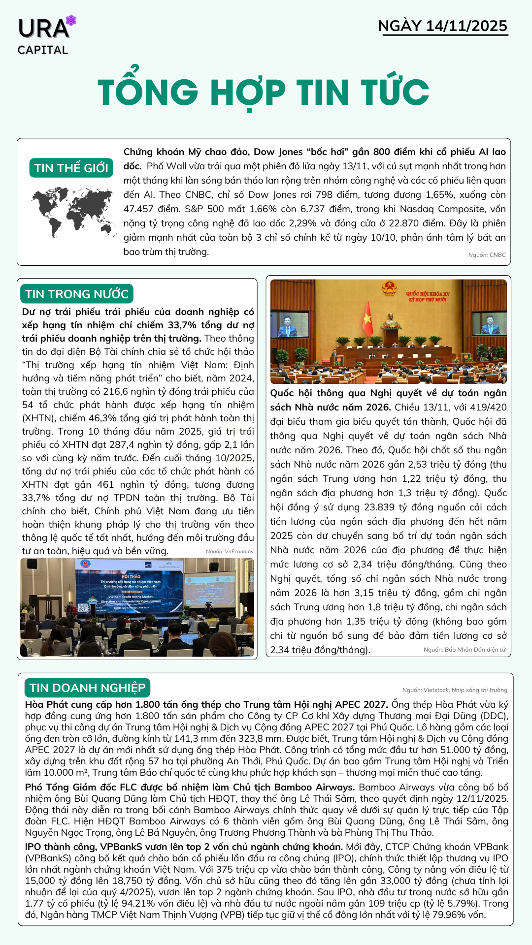 Tổng hợp tin tức 14/11/2025 Thứ Sáu, 14/11/2025 uracapital Chia sẻ bài viết: Menu Trang chủ Tin tức Báo cáo & Phân tích Báo cáo Phân tích Dịch vụ Tư vấn đầu tư Đào tạo kiến thức đầu tư Quản lý danh mục đầu tư Tư vấn kế hoạch tài chính Kiến thức đầu tư Kiến thức cơ bản Kiến thức nâng cao Phân tích kỹ thuật Phân tích kỹ thuật Phân tích cơ bản Hỗ trợ Hướng dẫn giao dịch Liên hệ Về Ura Capital Tin tức nổi bật