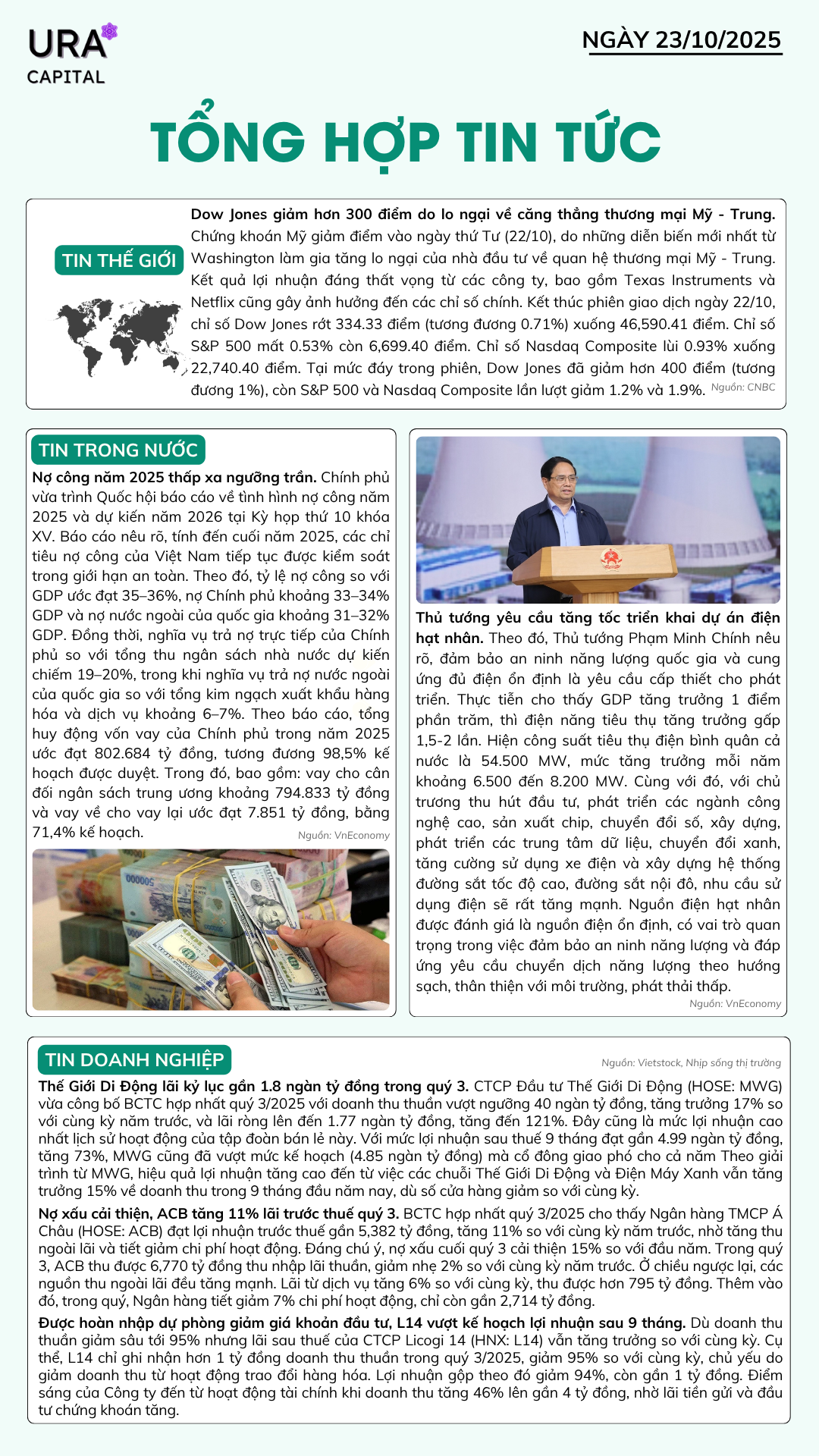 Tổng hợp tin tức 23/10/2025 Thứ Năm, 23/10/2025 uracapital Chia sẻ bài viết: Menu Trang chủ Tin tức Báo cáo & Phân tích Báo cáo Phân tích Dịch vụ Tư vấn đầu tư Đào tạo kiến thức đầu tư Quản lý danh mục đầu tư Tư vấn kế hoạch tài chính Kiến thức đầu tư Kiến thức cơ bản Kiến thức nâng cao Phân tích kỹ thuật Phân tích kỹ thuật Phân tích cơ bản Hỗ trợ Hướng dẫn giao dịch Liên hệ Về Ura Capital Tin tức nổi bật