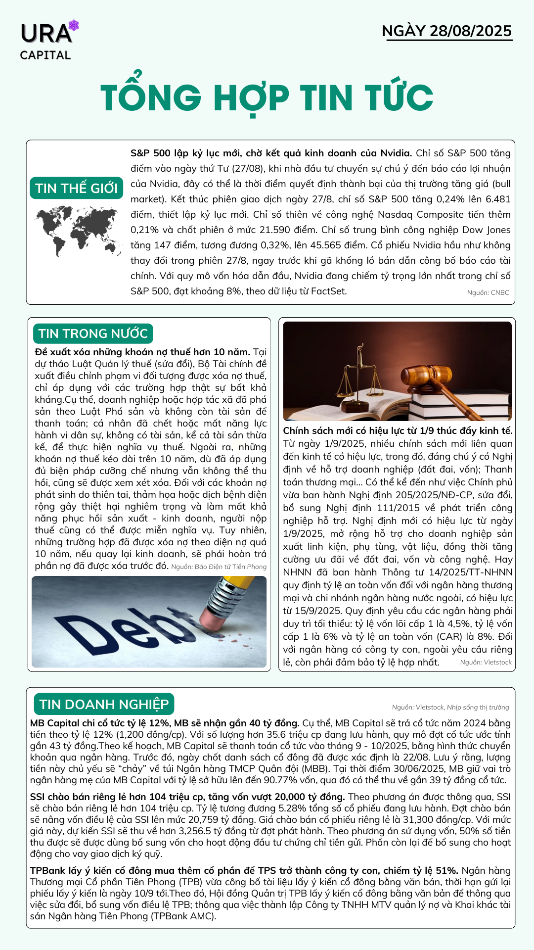 Tổng hợp tin tức ngày 28/08/2025 Thứ Năm, 28/08/2025 uracapital Chia sẻ bài viết: Menu Trang chủ Tin tức Báo cáo & Phân tích Báo cáo Phân tích Dịch vụ Tư vấn đầu tư Đào tạo kiến thức đầu tư Quản lý danh mục đầu tư Tư vấn kế hoạch tài chính Kiến thức đầu tư Kiến thức cơ bản Kiến thức nâng cao Phân tích kỹ thuật Phân tích kỹ thuật Phân tích cơ bản Hỗ trợ Hướng dẫn giao dịch Liên hệ Về Ura Capital Tin tức nổi bật