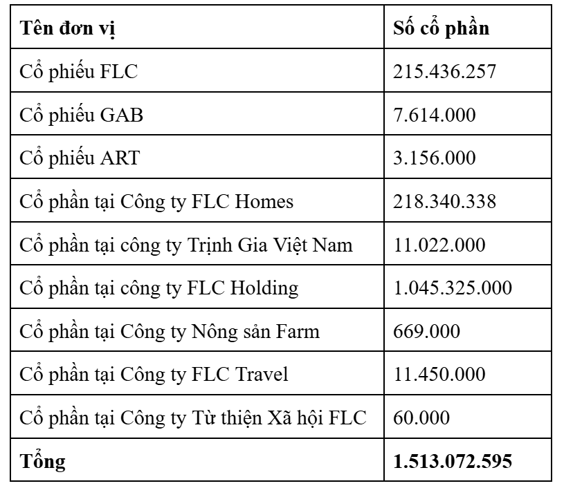 Theo thống kê, có hơn 1,5 tỷ cổ phần các loại thuộc nhiều công ty khác nhau trong hệ sinh thái, thuộc sở hữu của 3 anh em ông Trịnh Văn Quyết, đã bị kê biên. Trong đó, nhiều nhất là hơn 1 tỷ cổ phần tại CTCP Quản lý vốn và tài sản FLC Holding. Nhóm cổ phiếu từng giao dịch trên sàn, bị kê biên, gồm FLC, GAB và ART.